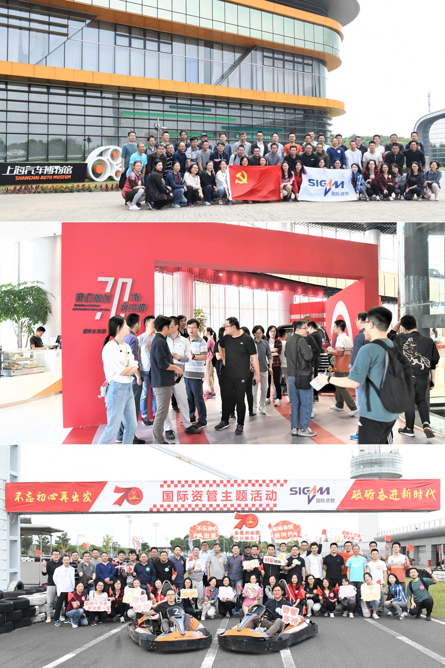 10月12日,國際資管公司組織全體(tǐ)員工開(kāi)展“不忘初心再出發,砥砺奮進新時(shí)代”慶祝中華人(rén)民共和(hé)國成立70周年主題拓展活動。大(dà)家(jiā)共同參觀了上(shàng)海汽車(chē)博物館國慶特展,回顧祖國汽車(chē)工業70年發展曆程,并在上(shàng)海國際賽車(chē)場(chǎng)開(kāi)展全員素質拓展活動。全體(tǐ)員工同場(chǎng)競技(jì)顯身手,你(nǐ)追我趕展風采,以朝氣蓬勃、積極向上(shàng)的精神面貌共同慶祝中華人(rén)民共和(hé)國成立70周年。