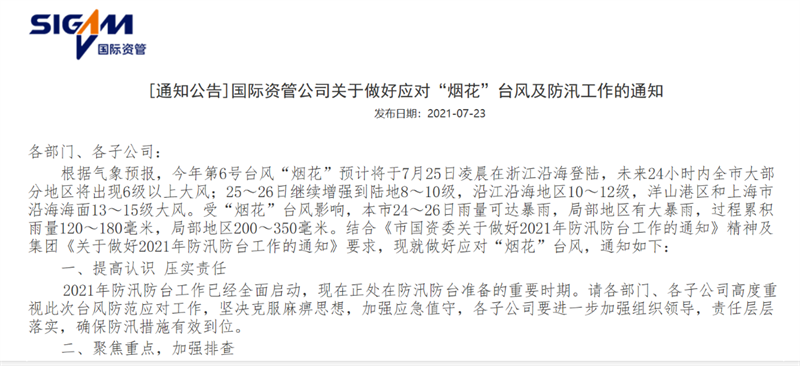 根據集團相關要求,國際資管公司密切關注台風“煙花(huā)”走勢,領導靠前指揮,各子公司快速響應,積極應對台風來(lái)襲。
