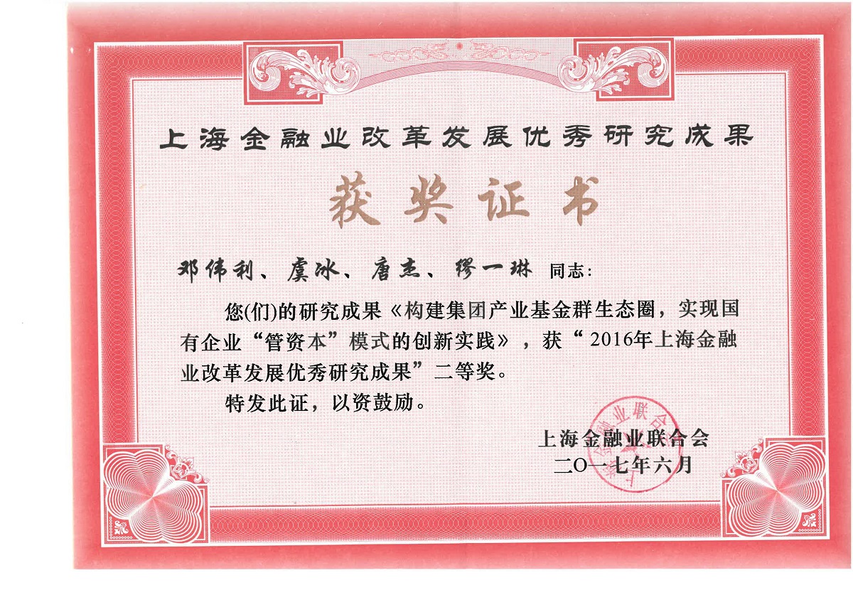 2017年6月8日下午,上(shàng)海金融業聯合會(huì)在上(shàng)海金融信息中心舉辦了 “2016年上(shàng)海金融業改革發展優秀研究成果”大(dà)賽頒獎儀式。徽仁芃盈資産管理(上海)有限公司申報的《上(shàng)海國際集團以母基金為(wèi)紐帶構建集團産業基金群生(shēng)态圈,實現國有(yǒu)企業“管資本”模式創新的實踐》研究成果,從222項申報材料中脫穎而出榮獲二等獎,此舉充分肯定了我公司在推進上(shàng)海國際金融中心建設中作(zuò)出的積極貢獻。